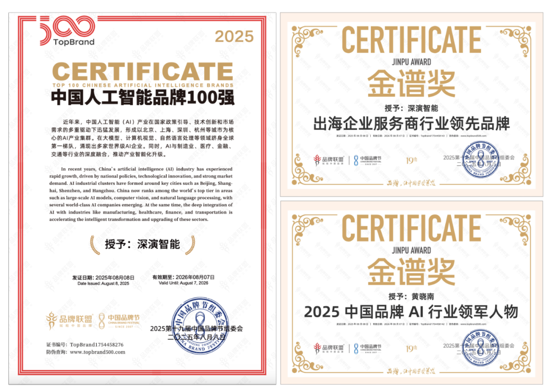 8 月 9 日晚举办的荣耀盛典上,深演智能凭借深厚的 AI 技术实力与出色专业的出海服务能力,斩获 “2025 中国品牌节金谱奖・出海企业服务商行业领先品牌”“2025 中国人工智能 100 强” 等多项重磅奖项。其创始人兼 CEO 黄晓南荣膺 “2025 中国品牌 AI 行业领军人物” 称号。未来,深演智能将紧跟时代步伐,持续聚焦 “AI 与出海”—— 这一方向高度契合时代脉搏与中国品牌发展的迫切需求,旨在汇聚智慧力量破解发展阻碍,为中国品牌赋能。